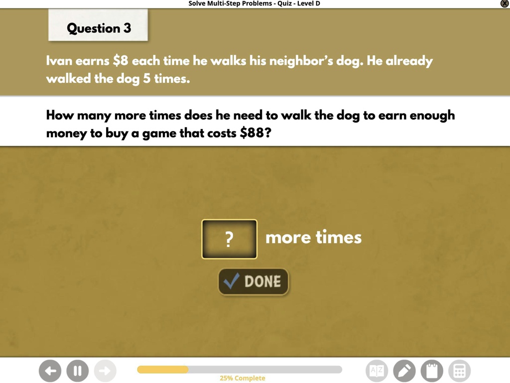 'I don't understand this!!! Solve Multi-Pace Problems Quiz Level D Question 3 Ivan earns $eight each time he walks his neighbor' south dog:{ He already walked the dog 5 times: How many more than times does he need to walk the dog " to earn enough coin to purchase a game that costs $88? 2 more times Washed 2504 Complete'